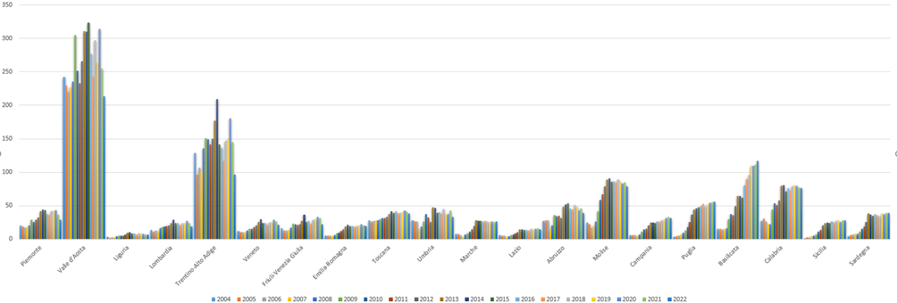 | Trentino-Alto Adige | 129,1 | 97 | 106,7 | 101,7 | 135,4 | 150,6 | 148,9 | 141,7 | 150,2 | 176,8 |
