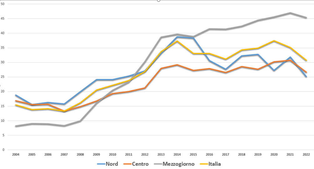 | Mezzogiorno | 8,2 | 9 | 8,9 | 8,3 | 10 | 16,1 | 20,4 | 23,3 | 30,2 | 38,7 |