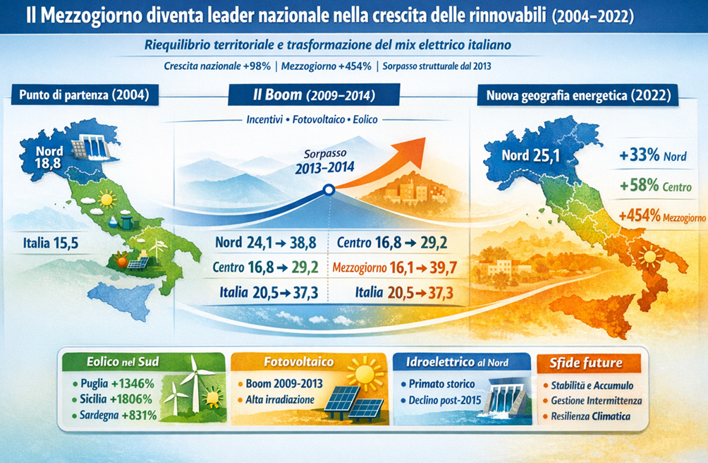 Negli ultimi due decenni il sistema elettrico italiano è stato attraversato da una trasformazione profonda, che ha progressivamente modificato il mix di produzione e il peso relativo delle diverse fonti energetiche. Al centro di questo cambiamento si colloca la crescita dell’energia elettrica da fonti rinnovabili, divenuta uno degli assi portanti delle politiche ambientali ed economiche nazionali. L’arco temporale compreso tra il 2004 e il 2022 rappresenta una finestra particolarmente significativa per osservare questa evoluzione, perché include sia la fase iniziale di sviluppo delle nuove tecnologie sia il periodo di massima espansione legato agli incentivi, fino alla più recente fase di consolidamento. L’analisi dei dati aggregati per Nord, Centro e Mezzogiorno consente di cogliere non solo l’aumento complessivo della quota di rinnovabili, ma anche il modo in cui la transizione energetica abbia inciso in maniera differenziata sui territori. Se nei primi anni Duemila il primato spettava chiaramente al Nord, grazie al peso storico dell’idroelettrico alpino, nel corso del tempo il Mezzogiorno ha progressivamente assunto un ruolo trainante, sostenuto soprattutto dallo sviluppo dell’eolico e del fotovoltaico. Il Centro, dal canto suo, ha mostrato una crescita più equilibrata, consolidando la propria posizione senza registrare variazioni estreme. Questa dinamica non è soltanto un fenomeno tecnico o ambientale, ma riflette scelte politiche, incentivi economici, innovazioni tecnologiche e condizioni naturali differenti. Comprendere come e perché si sia verificato questo riequilibrio territoriale permette di interpretare meglio le sfide attuali della decarbonizzazione e di delineare le prospettive future del sistema elettrico italiano, in un contesto europeo sempre più orientato alla neutralità climatica.