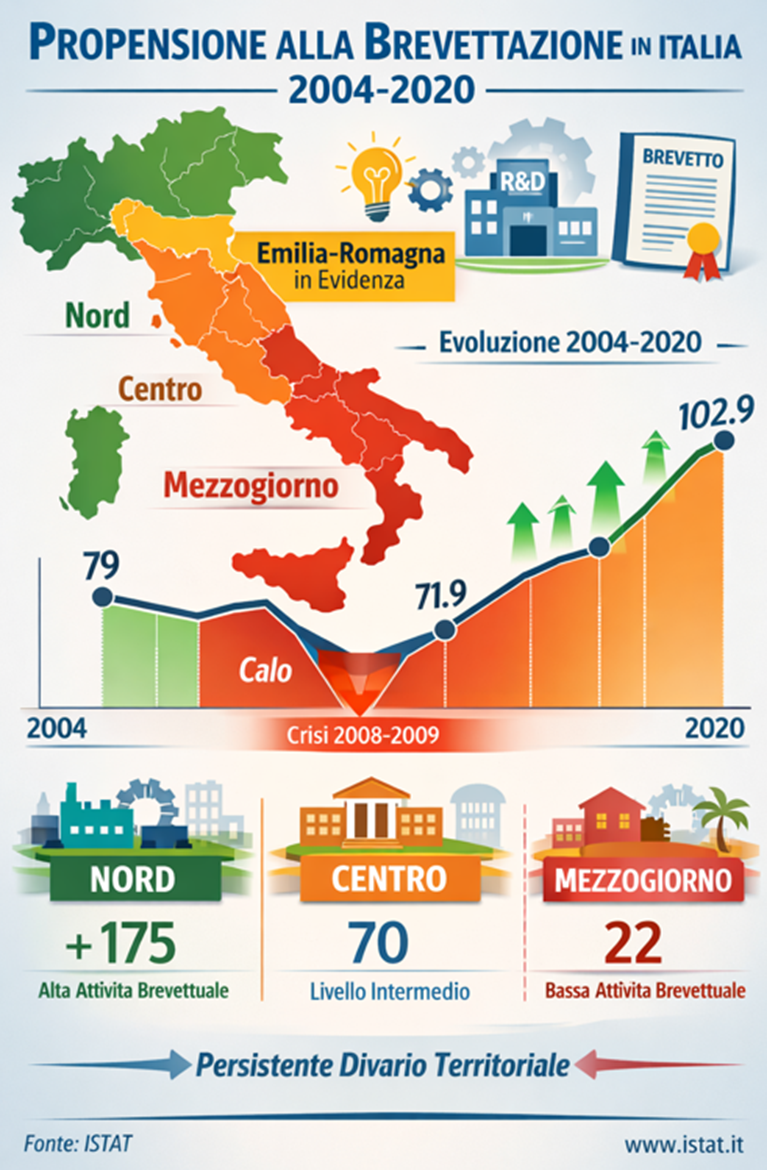 L’innovazione tecnologica rappresenta uno dei principali fattori di crescita economica e competitività dei sistemi produttivi contemporanei. Tra gli indicatori più utilizzati per analizzare la capacità innovativa di un territorio vi è la propensione alla brevettazione, che misura la tendenza di imprese, università e centri di ricerca a trasformare le attività di ricerca e sviluppo in invenzioni formalmente riconosciute attraverso il deposito di brevetti. L’analisi di questo indicatore consente quindi di comprendere non solo il livello di sviluppo tecnologico di un Paese, ma anche le differenze territoriali nella capacità di generare e valorizzare conoscenza. Nel caso italiano, la distribuzione dell’attività brevettuale presenta storicamente una forte dimensione territoriale. Il sistema economico nazionale è infatti caratterizzato da una significativa eterogeneità regionale, che si riflette nella diversa intensità delle attività di ricerca, nella presenza di distretti industriali e poli tecnologici, nonché nel grado di integrazione tra università, imprese e istituzioni. Di conseguenza, la capacità di produrre innovazione e di trasformarla in brevetti risulta concentrata soprattutto nelle aree economicamente più sviluppate del Paese. Questo articolo analizza l’evoluzione della propensione alla brevettazione in Italia nel periodo compreso tra il 2004 e il 2020, con particolare attenzione alle differenze tra regioni e macro-aree territoriali. L’obiettivo è evidenziare le principali tendenze nel lungo periodo, individuando eventuali cambiamenti nella distribuzione territoriale dell’attività innovativa e valutando l’impatto di fattori economici e strutturali sull’andamento dell’indicatore. In particolare, l’analisi si concentra sul confronto tra Nord, Centro e Mezzogiorno, al fine di mettere in luce la presenza di eventuali divari territoriali nella capacità innovativa del Paese. Il periodo considerato è inoltre particolarmente significativo, poiché include fasi economiche molto diverse tra loro: gli anni precedenti alla crisi finanziaria globale del 2008, la fase di contrazione dell’economia e degli investimenti in ricerca e sviluppo, e infine il periodo di progressiva ripresa che ha caratterizzato la seconda metà degli anni 2010. Analizzare l’andamento della propensione alla brevettazione in questo arco temporale consente quindi di comprendere come i sistemi regionali dell’innovazione abbiano reagito ai cambiamenti economici e quali territori abbiano mostrato una maggiore capacità di adattamento e crescita. Attraverso l’analisi dei dati disponibili, l’articolo intende quindi offrire un quadro complessivo delle dinamiche dell’innovazione in Italia, evidenziando sia i progressi registrati nel lungo periodo sia le persistenti disuguaglianze territoriali che caratterizzano il sistema innovativo nazionale.