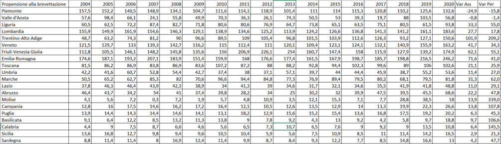 L’analisi della propensione alla brevettazione delle regioni italiane nel periodo 2004-2020 evidenzia dinamiche territoriali molto differenziate e mette in luce il persistente divario tra Nord e Sud del Paese in termini di capacità innovativa. Il dataset mostra l’evoluzione annuale dell’indicatore, accompagnata dalla variazione assoluta e percentuale tra l’inizio e la fine del periodo considerato. Nel complesso emerge un quadro caratterizzato da un’elevata concentrazione dell’attività brevettuale nelle regioni settentrionali, mentre il Mezzogiorno presenta valori sensibilmente più bassi, sebbene in alcuni casi si registrino segnali di crescita nel lungo periodo.