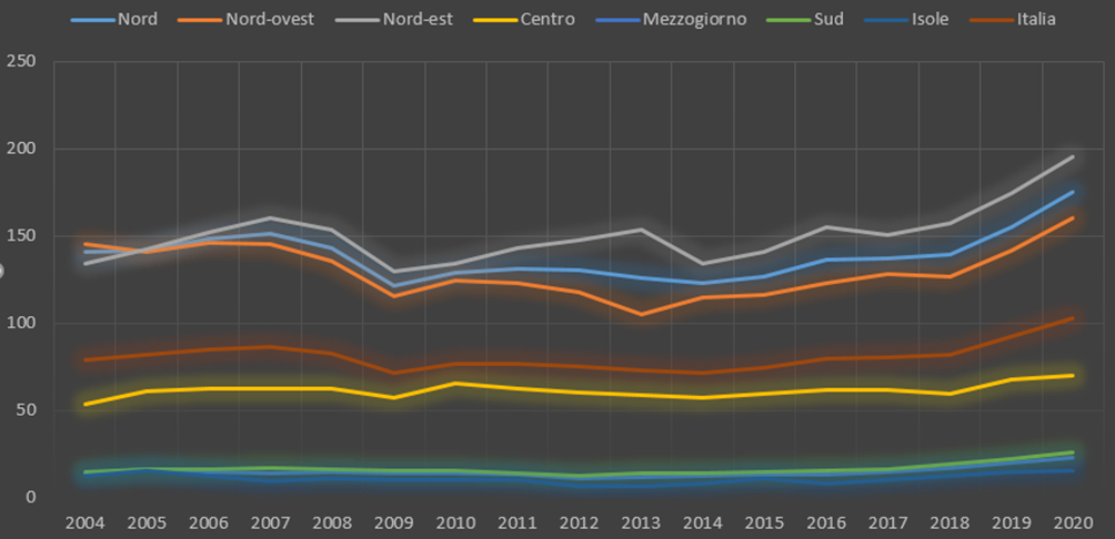 Tra le regioni settentrionali si distingue invece il Piemonte per un andamento leggermente negativo nel lungo periodo. Nonostante parta da valori molto elevati (157,5 nel 2004), nel 2020 registra 132,6, con una diminuzione assoluta di 24,9 punti e una riduzione percentuale del 15,8%. Questo calo potrebbe essere legato alle trasformazioni strutturali dell’industria piemontese, storicamente legata al settore automobilistico e alla grande industria manifatturiera, che negli ultimi decenni ha attraversato processi di ristrutturazione.
