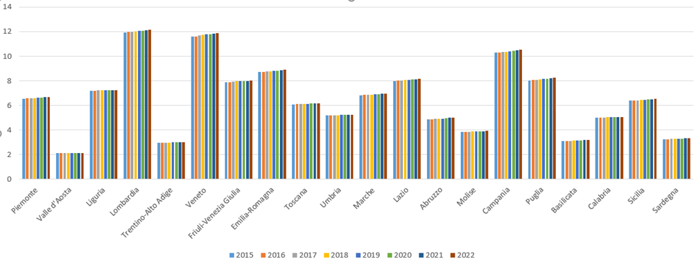 - Dal 2015 al 2022 tutte le regioni italiane registrano un aumento costante dell’impermeabilizzazione del suolo.