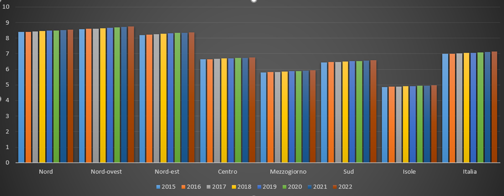 Il Nord si conferma l’area con i livelli più elevati di impermeabilizzazione. Nel 2022 raggiunge l’8,55%, partendo dall’8,39% del 2015, con una crescita dell’1,91%. All’interno del Nord, però, emergono differenze interessanti tra Nord-ovest e Nord-est. Il Nord-ovest presenta valori leggermente più alti in termini assoluti (da 8,59 a 8,74), ma una crescita percentuale più contenuta (+1,75%). Il Nord-est, invece, pur partendo da un livello inferiore (8,20 nel 2015), arriva a 8,38 nel 2022 e registra l’aumento relativo più marcato tra le ripartizioni settentrionali (+2,20%). Questo suggerisce che nelle regioni del Nord-est il ritmo di trasformazione del suolo sia stato più intenso, probabilmente in relazione alla forte dinamica insediativa e infrastrutturale che caratterizza queste aree, spesso segnate da urbanizzazione diffusa e sviluppo lungo i principali corridoi logistici.