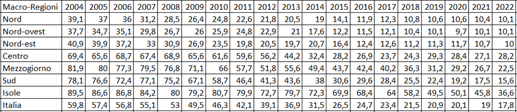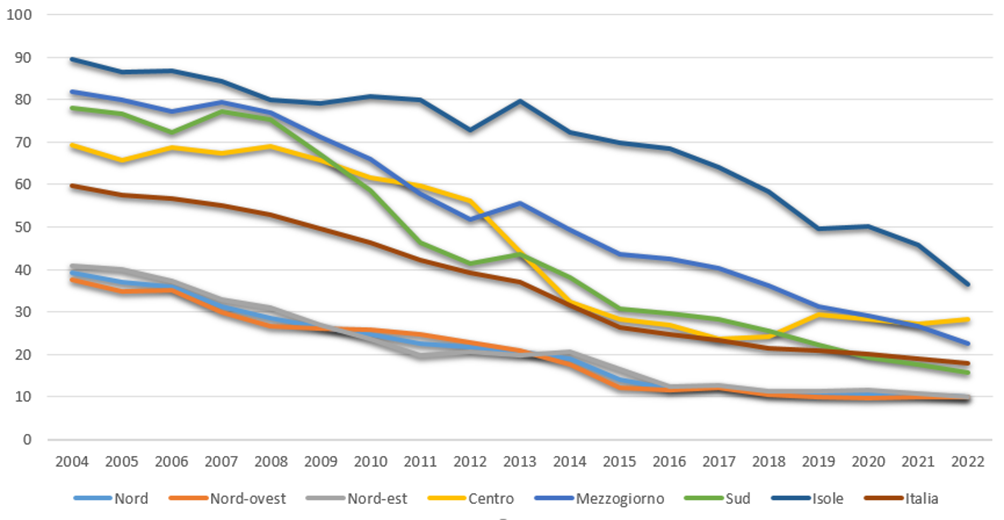 Il Centro presenta un quadro diverso, caratterizzato da valori iniziali molto elevati e da una discesa più irregolare. Si passa da 69,4 nel 2004 a 28,2 nel 2022, con una riduzione di circa il 59%. Tuttavia il percorso non è lineare: dopo una fase di calo graduale fino al 2013, quando il valore scende a 44,2, si osserva un crollo più deciso fino al 2015, seguito da oscillazioni negli anni successivi, con una risalita intorno al 2019 e poi una nuova stabilizzazione poco sotto i 30. Questo andamento suggerisce che nel Centro la riduzione della discarica è stata in parte guidata da interventi specifici e da cambiamenti organizzativi, ma senza raggiungere ancora una stabilità paragonabile a quella del Nord.