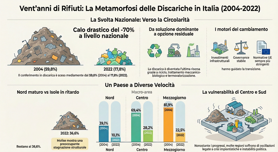 Negli ultimi vent’anni la gestione dei rifiuti urbani in Italia è stata al centro di un cambiamento profondo, che ha coinvolto politiche pubbliche, investimenti infrastrutturali, comportamenti dei cittadini e assetti industriali. La discarica, per decenni soluzione dominante e spesso quasi esclusiva per lo smaltimento dei rifiuti, è diventata progressivamente il simbolo di un modello da superare, sia per i suoi impatti ambientali sia per la sua inefficienza economica in un contesto che punta sempre di più al recupero di materia e all’economia circolare. Ridurre il conferimento in discarica non significa soltanto spostare i rifiuti verso altri impianti, ma implica ripensare l’intera filiera, dalla prevenzione alla raccolta differenziata, dal riciclo al trattamento dei residui, fino alla pianificazione territoriale degli impianti. In questo quadro, i dati sul conferimento dei rifiuti urbani in discarica tra il 2004 e il 2022 rappresentano una chiave di lettura privilegiata per capire quanto e come il sistema italiano sia cambiato. Non si tratta solo di numeri tecnici, ma di indicatori che riflettono scelte politiche, capacità amministrative, conflitti territoriali, emergenze improvvise e, in alcuni casi, vere e proprie svolte strutturali. Guardare a una serie storica così lunga consente di cogliere non solo la direzione generale del cambiamento, che è chiaramente orientata alla riduzione della discarica, ma anche le diverse velocità con cui questo processo si è sviluppato nelle varie parti del Paese. L’Italia, infatti, non si presenta come un sistema omogeneo. Le differenze tra Nord, Centro, Sud e Isole hanno radici profonde e si manifestano anche nella gestione dei rifiuti. In alcune aree la transizione verso modelli più avanzati è iniziata presto ed è stata relativamente stabile nel tempo; in altre, invece, il percorso è stato più tortuoso, segnato da ritardi, discontinuità e talvolta da crisi che hanno imposto cambiamenti rapidi ma non sempre consolidati. Analizzare i dati per macro-aree permette quindi di andare oltre la media nazionale e di mettere in luce queste divergenze, mostrando come la riduzione della discarica non sia stata un processo lineare né uniformemente distribuito. C’è poi un altro aspetto da considerare: la progressiva marginalizzazione della discarica non è solo il risultato di una maggiore sensibilità ambientale, ma anche di vincoli normativi sempre più stringenti a livello europeo e nazionale, che hanno reso questo tipo di smaltimento una scelta residuale e costosa. Allo stesso tempo, però, la disponibilità o meno di impianti alternativi, come quelli per il trattamento meccanico-biologico, per il recupero energetico o per il riciclo, ha inciso in modo decisivo sulle possibilità concrete dei territori di ridurre davvero i conferimenti. Per questo motivo, dietro a ogni curva che scende o che si stabilizza, ci sono decisioni di pianificazione, investimenti realizzati o rinviati, e spesso anche conflitti locali che hanno rallentato o accelerato i processi. Questo articolo si propone quindi di leggere l’evoluzione del conferimento in discarica non solo come un indicatore ambientale, ma come una lente attraverso cui osservare le trasformazioni, le contraddizioni e le asimmetrie del sistema italiano dei rifiuti negli ultimi vent’anni. I dati mostrano una tendenza complessiva positiva, con una forte riduzione a livello nazionale, ma raccontano anche una storia fatta di percorsi diversi, di successi consolidati e di ritardi ancora difficili da colmare. Comprendere questi andamenti è essenziale per valutare a che punto siamo arrivati e, soprattutto, per capire quali siano le sfide ancora aperte nella costruzione di un modello di gestione dei rifiuti più efficiente, equilibrato e coerente con gli obiettivi dell’economia circolare.