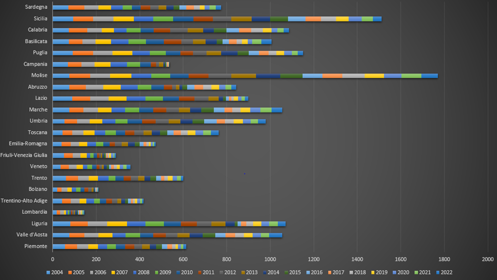 Macro-Regioni Italiane. I dati sul conferimento dei rifiuti urbani in discarica per le grandi ripartizioni territoriali tra il 2004 e il 2022 descrivono una trasformazione profonda del sistema italiano di gestione dei rifiuti, con una riduzione molto marcata del ricorso alla discarica ma anche con differenze territoriali ancora evidenti. Nel complesso nazionale si passa da un valore medio di 59,8 nel 2004 a 17,8 nel 2022, con una diminuzione di circa 42 punti e una contrazione superiore al 70%, un risultato che segnala un cambiamento strutturale nelle politiche di smaltimento, legato alla crescita della raccolta differenziata, allo sviluppo degli impianti di trattamento e a un quadro normativo sempre più restrittivo verso l’uso della discarica.