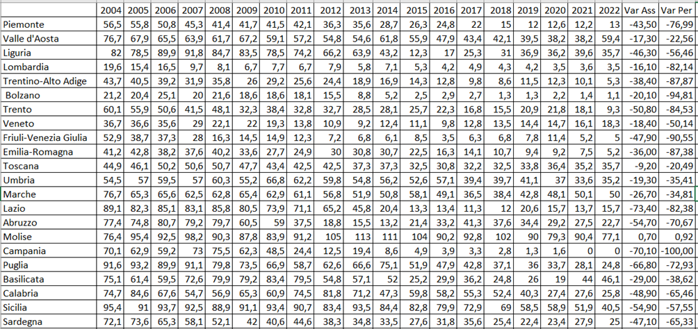 I dati sul conferimento dei rifiuti urbani in discarica dal 2004 al 2022 mostrano un cambiamento strutturale profondo del sistema italiano di gestione dei rifiuti, con un trend complessivamente decrescente quasi ovunque ma con velocità, discontinuità e risultati finali molto diversi tra regioni, a testimonianza di scelte politiche, investimenti impiantistici, capacità amministrativa e condizioni territoriali non omogenee. Nel Nord emerge con chiarezza una traiettoria di riduzione precoce e relativamente stabile, con la Lombardia che già nel 2004 parte da valori molto bassi, intorno al 19,6, e scende progressivamente fino a stabilizzarsi poco sopra il 3 nel 2022, segnando una delle migliori performance nazionali e una riduzione percentuale superiore all’80%, segnale di un sistema centrato su raccolta differenziata, recupero di materia e trattamento meccanico-biologico che ha ridotto la dipendenza dalla discarica a un ruolo residuale. Piemonte, Veneto, Emilia-Romagna e Friuli-Venezia Giulia seguono percorsi simili, anche se con andamenti più frastagliati: il Piemonte passa da oltre 56 a circa 13, con un calo netto ma con fasi di rallentamento e piccoli rimbalzi negli ultimi anni; il Veneto scende da circa 37 a 18,3 mostrando una riduzione meno drastica in termini relativi rispetto ad altre regioni settentrionali e una certa risalita dal 2014 in poi che segnala probabilmente tensioni impiantistiche o cambiamenti nella contabilizzazione dei flussi; il Friuli-Venezia Giulia compie una delle trasformazioni più radicali, passando da oltre 52 a circa 5, con una riduzione superiore al 90%, nonostante alcuni anni di oscillazioni che indicano aggiustamenti di sistema; l’Emilia-Romagna riduce da oltre 41 a poco più di 5, con un percorso graduale ma costante che la colloca tra i casi di successo più evidenti. Il Trentino-Alto Adige merita una lettura articolata perché la media regionale nasconde due traiettorie diverse: la Provincia autonoma di Bolzano parte già da valori bassi, intorno a 21, e scende fino a poco sopra 1 nel 2022, praticamente azzerando il ricorso alla discarica, mentre la Provincia autonoma di Trento parte da oltre 60 e scende fino a circa 9,3, con un miglioramento molto significativo ma più lento, e la media regionale riflette questa convergenza progressiva verso livelli molto bassi, segno che modelli organizzativi diversi possono comunque portare, nel medio periodo, a risultati simili se sostenuti da politiche coerenti. La Liguria è un caso interessante perché mostra un forte ricorso alla discarica nei primi anni, con valori che superano anche 90, poi un crollo repentino intorno al 2015, quando scende a 12,3, seguito da una risalita fino a valori intorno a 35-40 negli anni successivi, il che suggerisce una fase di transizione impiantistica non ancora consolidata, con probabili difficoltà nella chiusura del ciclo e una maggiore esposizione a emergenze o a esportazioni di rifiuti. Spostandosi al Centro, il quadro diventa più eterogeneo e meno lineare. La Toscana rimane per tutto il periodo su livelli medio-alti, partendo da circa 45 e chiudendo ancora sopra 35, con una riduzione complessiva modesta, intorno al 20%, e con un lungo plateau tra 2006 e 2013 che indica una certa inerzia strutturale; l’Umbria mostra valori elevati e molto oscillanti, con un picco oltre 66 nel 2010 e una discesa solo a partire dal 2016, per arrivare a circa 35 nel 2022, quindi con un miglioramento reale ma tardivo e incompleto; le Marche partono da circa 77 e scendono a 50, con un andamento che alterna cali e risalite e che nel finale resta su valori ancora molto alti rispetto agli obiettivi europei, segno che la transizione è stata parziale e probabilmente condizionata da limiti impiantistici o da scelte politiche non continuative. Il Lazio rappresenta uno dei casi più emblematici di cambiamento forzato: per molti anni i valori restano altissimi, oltre 80 fino al 2009 e ancora oltre 70 nel 2011, poi c’è una discesa drastica fino a circa 13 nel 2015-2016, legata chiaramente alla chiusura di grandi discariche e a una riorganizzazione del sistema, seguita però da oscillazioni che riportano il dato sopra 20 nel 2019 e poi di nuovo intorno a 15 nel 2022, il che mostra come la riduzione strutturale non sia stata completamente stabilizzata e come il sistema resti vulnerabile a crisi o a variazioni nella capacità di trattamento. Nel Sud e nelle Isole il quadro è ancora più complesso e mette in luce sia ritardi storici sia alcuni progressi molto rapidi ma non sempre consolidati. La Campania è il caso più spettacolare in termini numerici: da oltre 70 nel 2004 arriva praticamente a zero nel 2021 e 2022, con una riduzione del 100%, ma questo percorso è segnato da forti oscillazioni nei primi anni e da un crollo soprattutto dopo il 2010, che riflette il superamento graduale delle emergenze e l’avvio di sistemi alternativi, anche se il dato zero va interpretato con cautela perché potrebbe indicare trasferimenti fuori regione o ricorso massiccio ad altri trattamenti più che una chiusura completa del ciclo sul territorio. La Puglia scende da oltre 90 a circa 25, con una riduzione importante ma ancora insufficiente per allinearsi alle regioni più virtuose, e con un andamento che mostra una fase di peggioramento intorno al 2013-2014 prima di riprendere la discesa, segno di una transizione non lineare. L’Abruzzo passa da valori intorno a 77-80 a circa 23, con un miglioramento significativo ma con una risalita tra 2015 e 2017 che suggerisce problemi di capacità o di pianificazione. La Basilicata presenta un andamento irregolare, con valori molto alti fino al 2011, una discesa marcata fino al 2015, poi una nuova risalita nel 2017 e soprattutto nel 2021-2022, quando torna sopra 44 e 46, il che indica una fragilità strutturale del sistema e una dipendenza ancora forte dalla discarica in alcune fasi. La Calabria resta per molti anni su livelli elevati, con oscillazioni ampie tra 50 e olt