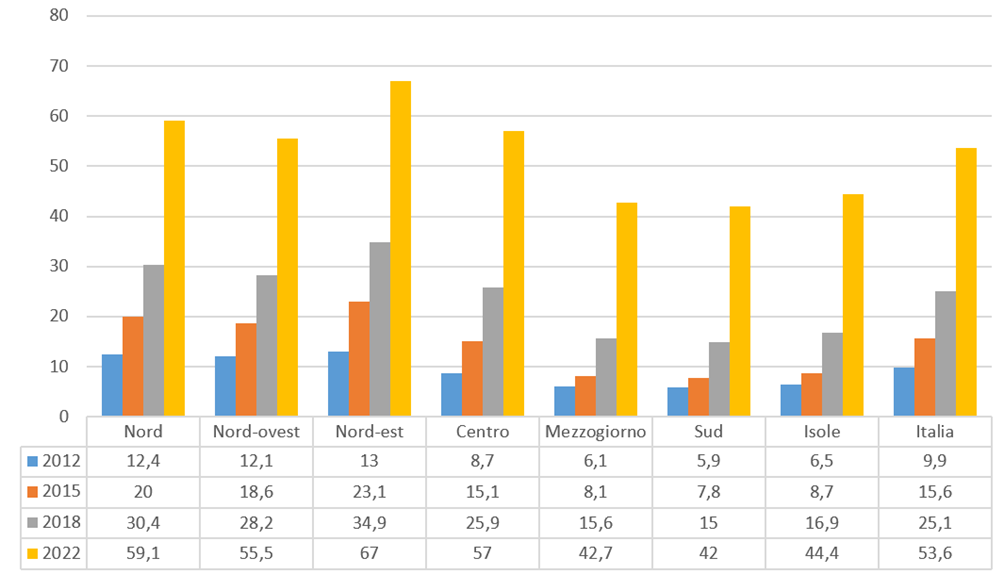 Il salto più rilevante si verifica però tra il 2018 e il 2022. In questi anni la quota nazionale raggiunge il 53,6%, segnando un aumento di oltre 28 punti percentuali in soli quattro anni. Tutte le macro-aree registrano incrementi molto consistenti: il Nord arriva al 59,1%, il Centro al 57% e il Mezzogiorno al 42,7%. In particolare, il Nord-est raggiunge il valore più elevato (67%), confermandosi come l’area più avanzata del Paese. Il Nord-ovest si attesta al 55,5%, mentre Sud (42%) e Isole (44,4%) restano al di sotto della media nazionale, ma con progressi significativi.